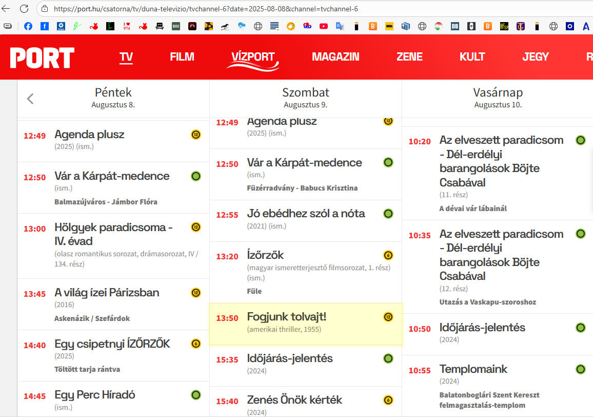 - (FilmMúzeum / MTV 1 / Tv2): - Rémület a színpadon (1950) - Filmmúzeum: nov.2. 21:00 - Meggyónom (1952) -Filmmúzeum: nov.9. 21:00 ------> újságcikk - A tizenhetes számú ház (1932) - M1: dec. 11. 1:15 - Téboly (1972) - Tv2: december 13. 0:20 - Félelem reflektorfényben (1950) - Filmmúzeum: december 19. 23:05 - Gyilkosság telefonhívásra (1954) - Filmmúzeum: december 26. 23:25 |